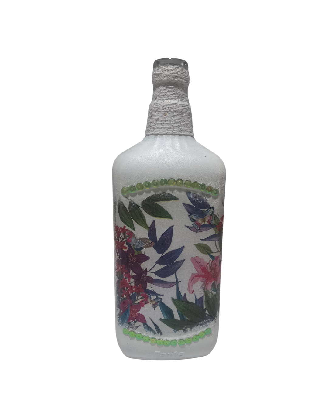 Especificações: Garrafa de vidro com pitura em decoupage no tamanho de 07 x 09 x 26 cm.