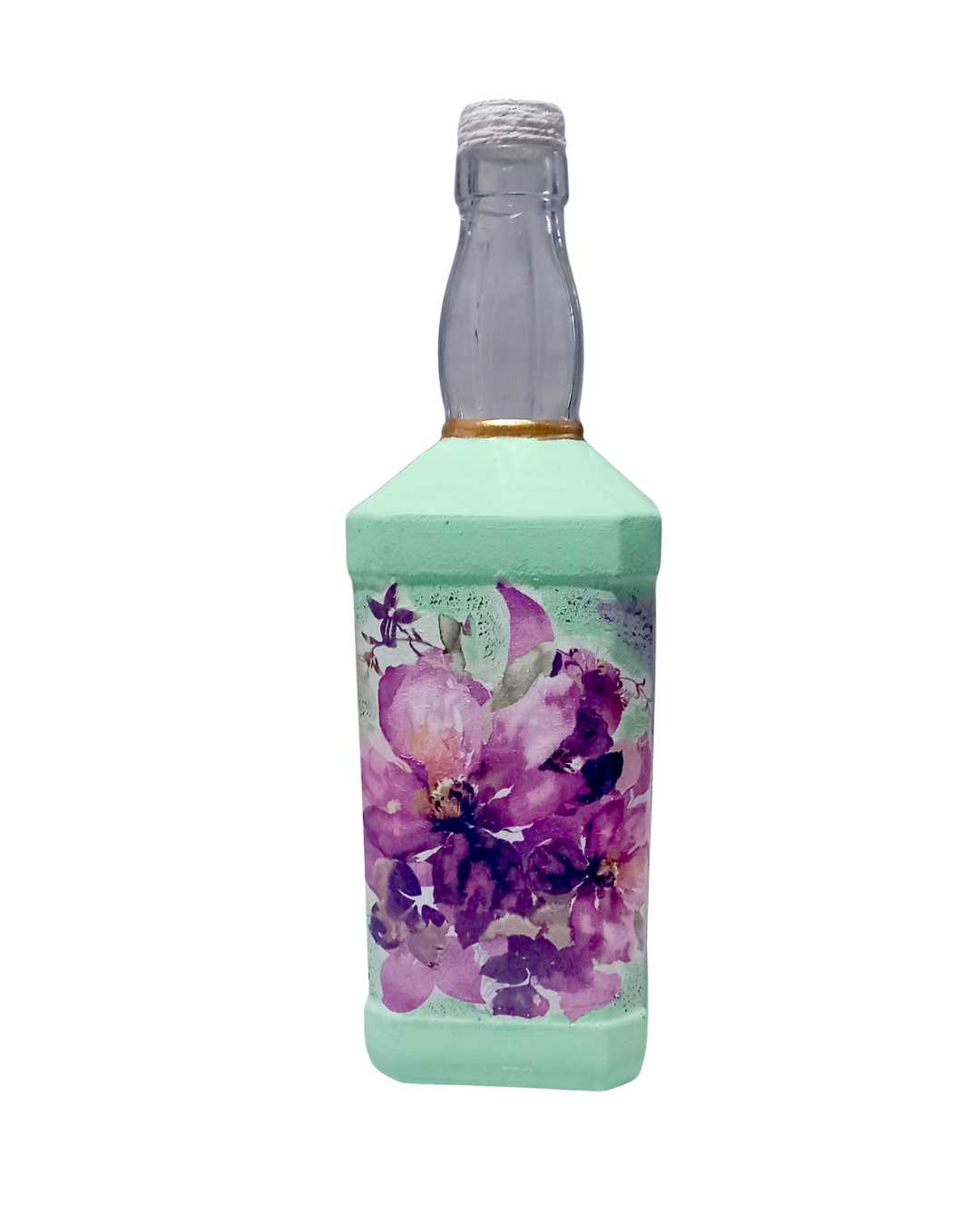 Especificações: Garrafa de vidro com pitura em decoupage no tamanho de 08 x 08 x 25 cm.