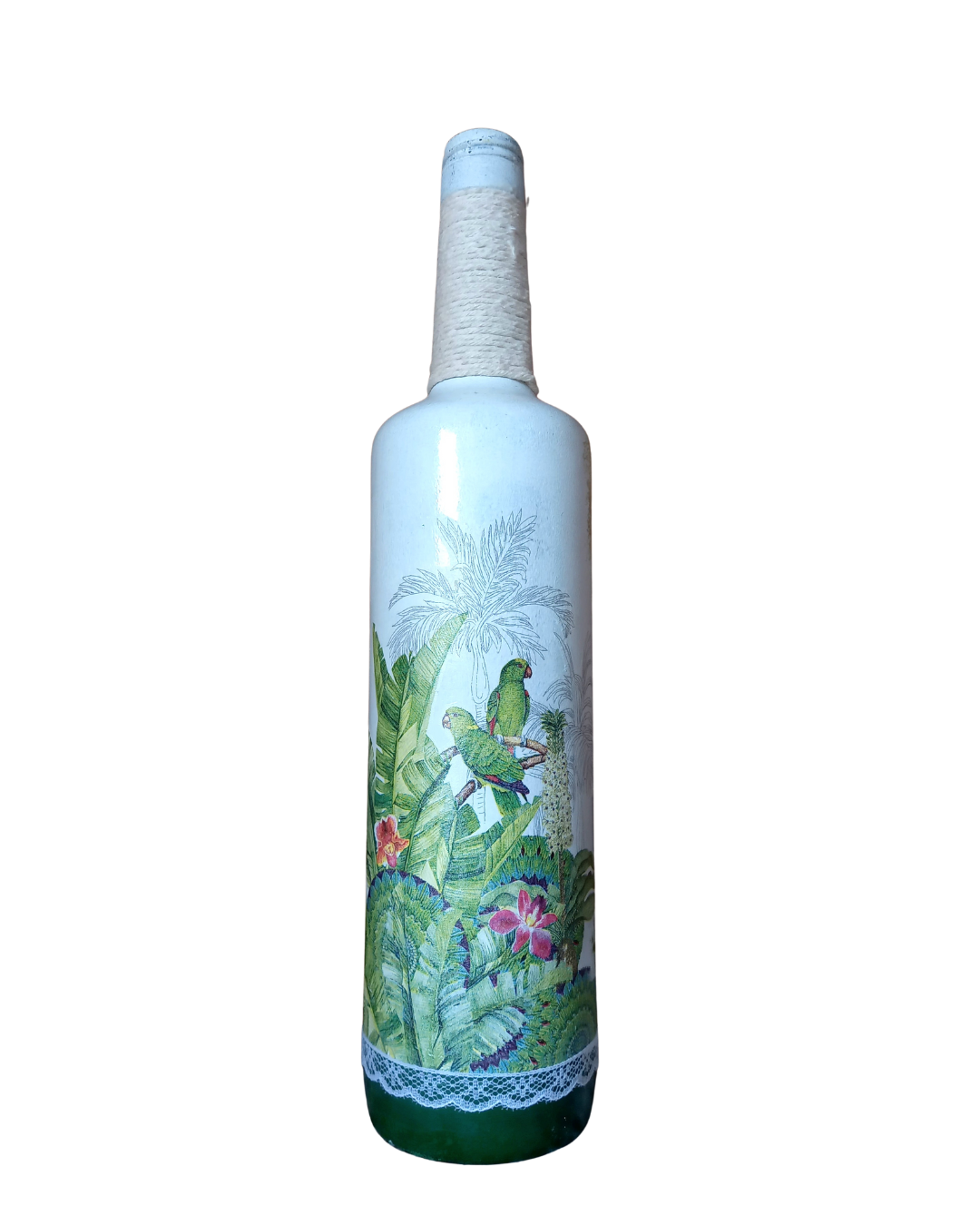 Especificações: Garrafa de vidro com pitura em decoupage no tamanho de 08 x 08 x 29 cm.