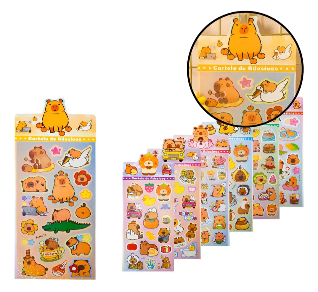 Com ilustrações super divertidas e acabamento brilhante, cada cartela traz adesivos temáticos de capivaras em diferentes situações e expressões, perfeitos para quem ama papelaria criativa.