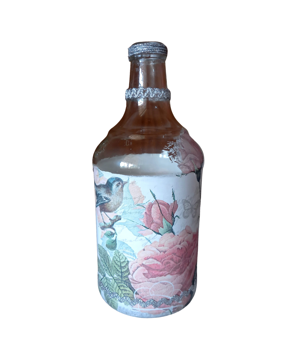 Garrafa decorada - pássaro e rosas por Débora Artes
