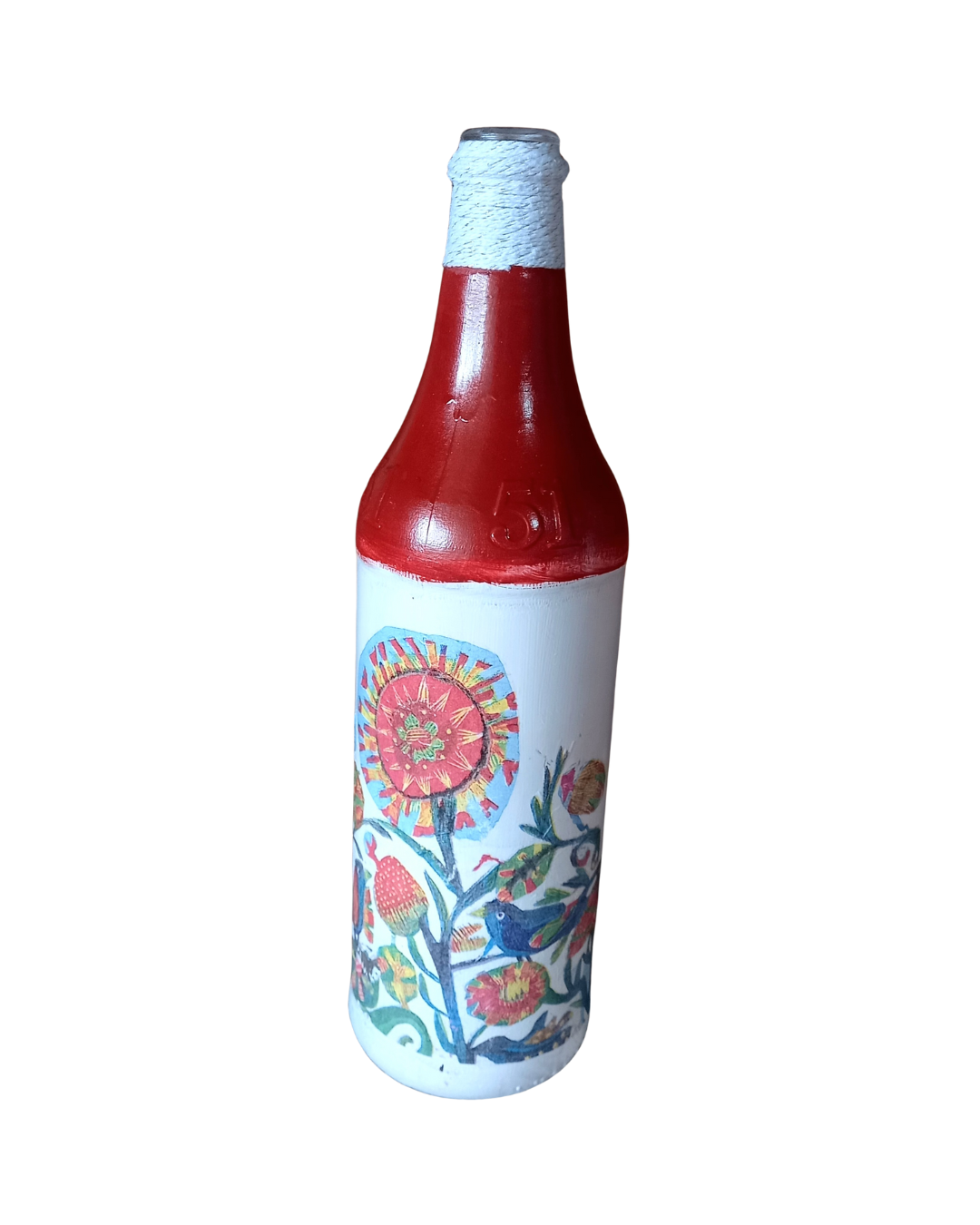 Especificações: Garrafa de vidro com pitura em decoupage no tamanho de 08 x 08 x 29 cm.