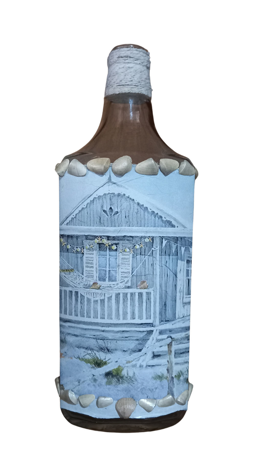 Especificações: Garrafa de vidro com pitura em decoupage no tamanho de 07 x 09 x 28 cm.