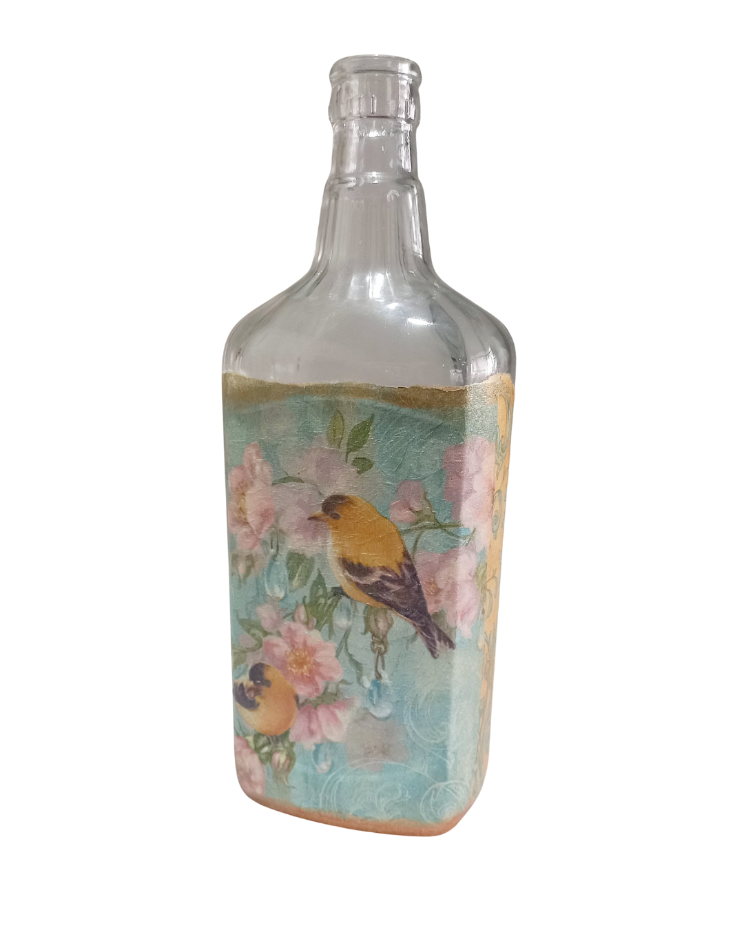 Especificações: Garrafa de vidro com pitura em decoupage no tamanho de 07 x 09 x 26 cm.