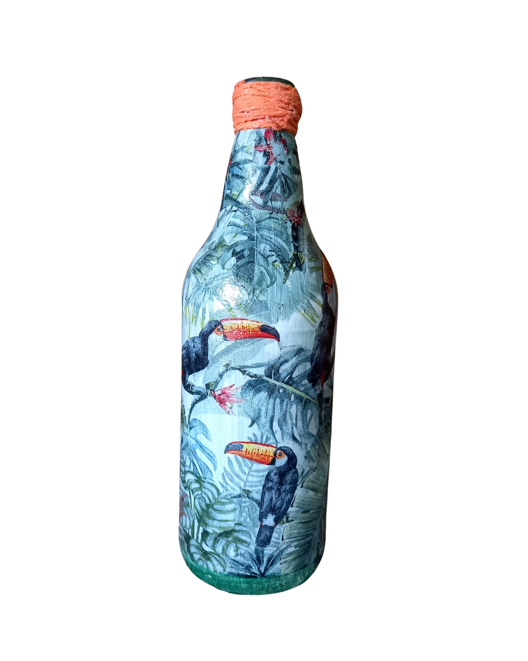 Especificações: Garrafa de vidro com pitura em decoupage no tamanho de 07 x 07 x 23 cm.