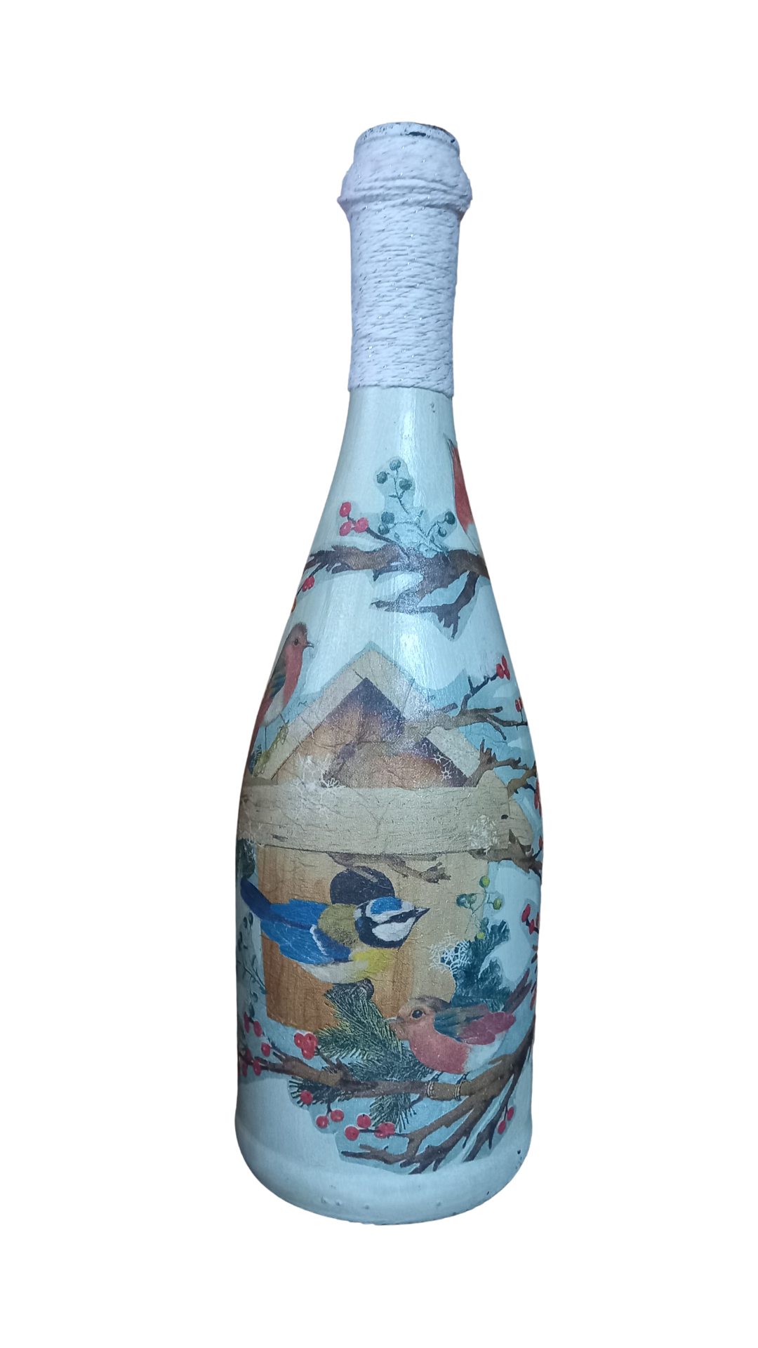 Especificações: Garrafa de vidro com pitura em decoupage no tamanho de 09 x 09 x 29 cm.