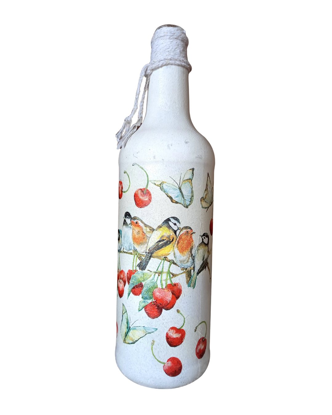 Especificações: Garrafa de vidro com pitura em decoupage no tamanho de 08 x 08 x 29 cm.